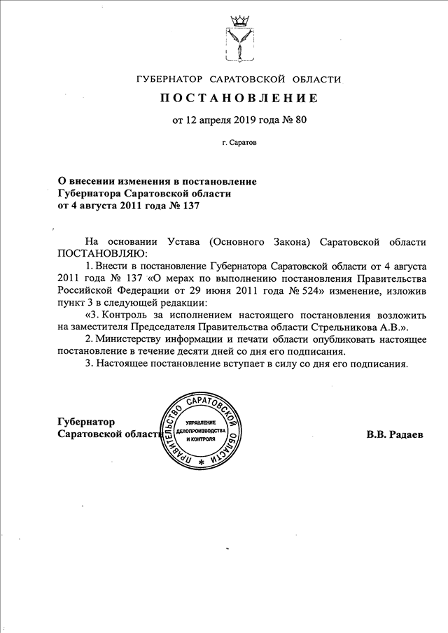 Постановление Губернатора Саратовской области от 12.04.2019 N 80 "О внесении изменения в постановление Губернатора Саратовской области от 4 августа 2011 года N 137"