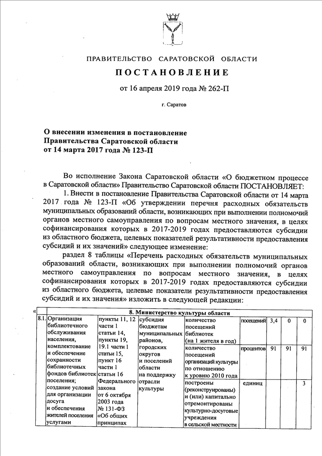 Постановление Правительства Саратовской области от 16.04.2019 N 262-П "О внесении изменения в постановление Правительства Саратовской области от 14 марта 2017 года N 123-П"