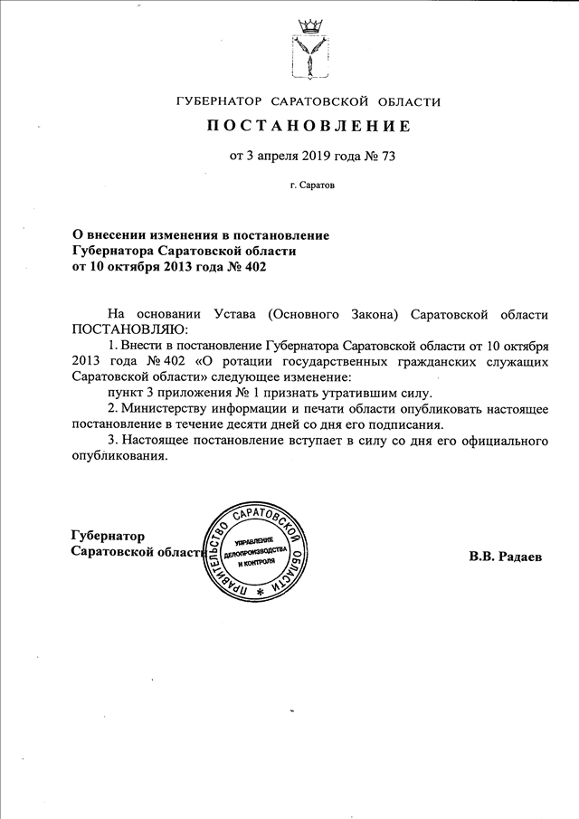 Постановление Губернатора Саратовской области от 03.04.2019 N 73 "О внесении изменения в постановление Губернатора Саратовской области от 10 октября 2013 года N 402"
