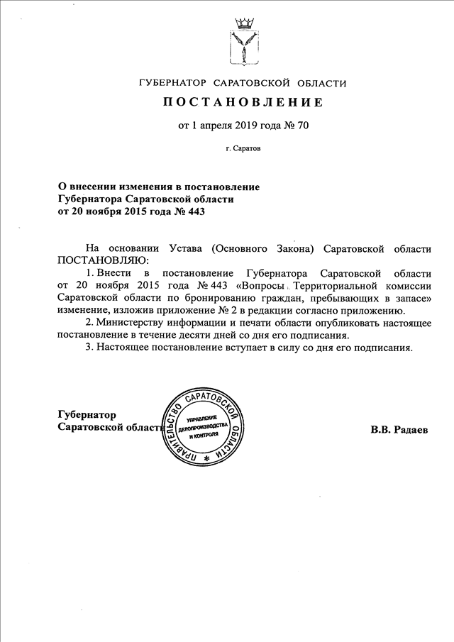 Постановление Губернатора Саратовской области от 01.04.2019 N 70 "О внесении изменения в постановление Губернатора Саратовской области от 20 ноября 2015 года N 443"