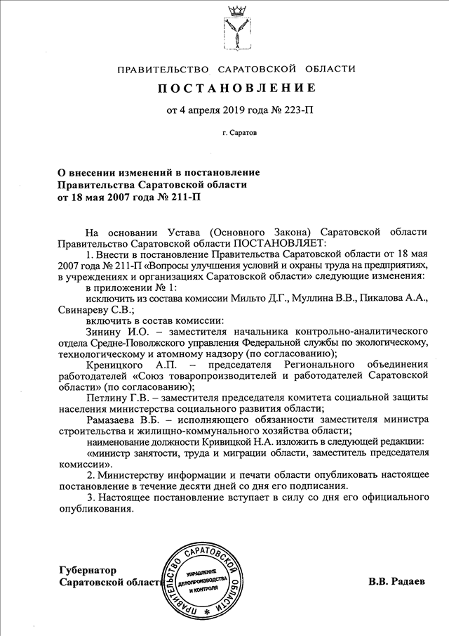 Постановление Правительства Саратовской области от 04.04.2019 N 223-П "О внесении изменений в постановление Правительства Саратовской области от 18 мая 2007 года N 211-П"