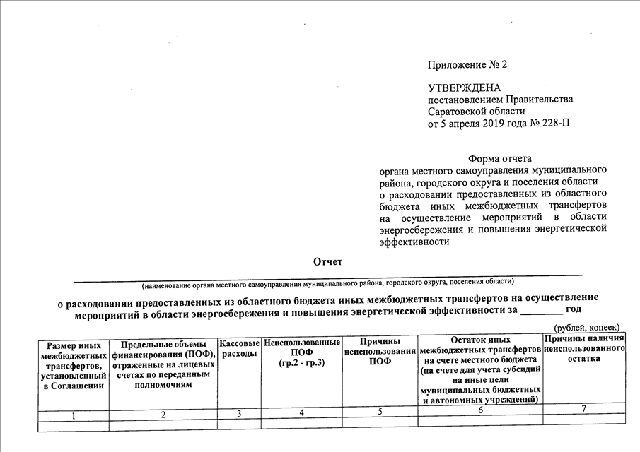 Постановление Правительства Саратовской области от 05.04.2019 N 228-П "О порядке предоставления из областного бюджета иных межбюджетных трансфертов бюджетам муниципальных районов, городских округов и поселений области на осуществление мероприятий в области энергосбережения и повышения энергетической эффективности" (вместе с "Положением о порядке предоставления из областного бюджета иных межбюджетных трансфертов бюджетам муниципальных районов, городских округов и поселений области на осуществление мероприятий в области энергосбережения и повышения энергетической эффективности")