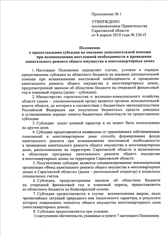 Постановление Правительства Саратовской области от 08.04.2019 N 230-П "Об утверждении Положения о предоставлении субсидии на оказание дополнительной помощи при возникновении неотложной необходимости в проведении капитального ремонта общего имущества в многоквартирных домах" (вместе с "Отчетом-заявкой получателя субсидии на предоставление из областного бюджета субсидии на оказание дополнительной помощи при возникновении неотложной необходимости в проведении капитального ремонта общего имущества в многоквартирных домах", "Сводным отчетом министерства строительства и жилищно-коммунального хозяйства области об использовании субсидии, предоставленной из областного бюджета на оказание дополнительной помощи при возникновении неотложной необходимости в проведении капитального ремонта общего имущества в многоквартирных домах")