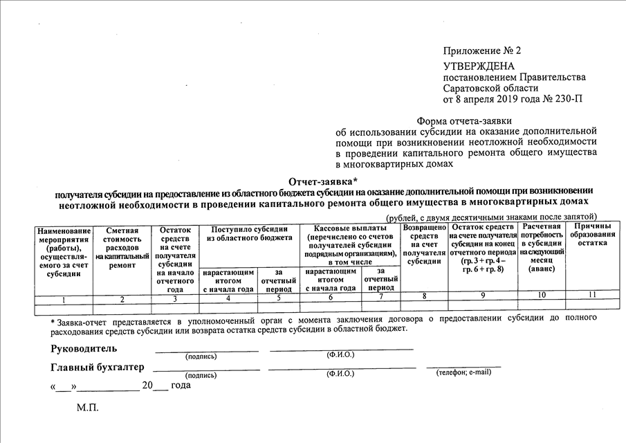 Постановление Правительства Саратовской области от 08.04.2019 N 230-П "Об утверждении Положения о предоставлении субсидии на оказание дополнительной помощи при возникновении неотложной необходимости в проведении капитального ремонта общего имущества в многоквартирных домах" (вместе с "Отчетом-заявкой получателя субсидии на предоставление из областного бюджета субсидии на оказание дополнительной помощи при возникновении неотложной необходимости в проведении капитального ремонта общего имущества в многоквартирных домах", "Сводным отчетом министерства строительства и жилищно-коммунального хозяйства области об использовании субсидии, предоставленной из областного бюджета на оказание дополнительной помощи при возникновении неотложной необходимости в проведении капитального ремонта общего имущества в многоквартирных домах")