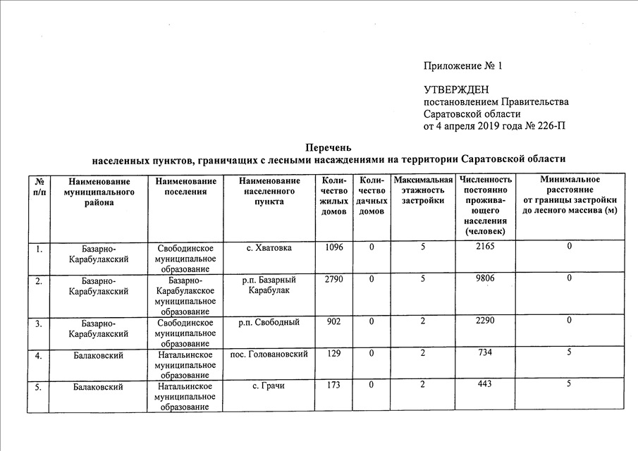 Постановление Правительства Саратовской области от 04.04.2019 N 226-П "О комплексе мер по подготовке к весенне-летнему пожароопасному сезону 2019 года и утверждении перечня населенных пунктов и объектов, граничащих с лесными насаждениями" (вместе с "Перечнем населенных пунктов, граничащих с лесными насаждениями на территории Саратовской области", "Перечнем объектов, организующих детский оздоровительный отдых, граничащих с лесными насаждениями на территории Саратовской области", "Перечнем некоммерческих организаций, создаваемых гражданами для ведения садоводства или огородничества, граничащих с лесными насаждениями на территории Саратовской области")