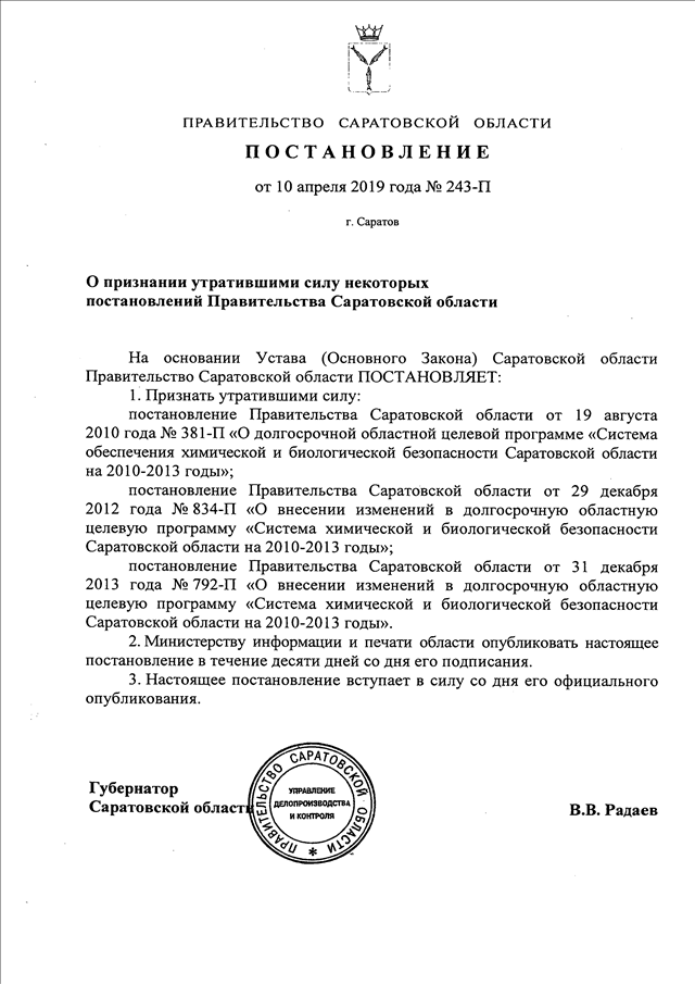 Постановление Правительства Саратовской области от 10.04.2019 N 243-П "О признании утратившими силу некоторых постановлений Правительства Саратовской области"