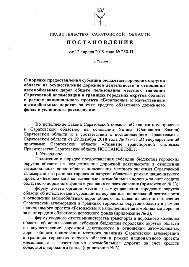 Постановление Правительства Саратовской области от 12.04.2019 N 250-П "О порядке предоставления субсидии бюджетам городских округов области на осуществление дорожной деятельности в отношении автомобильных дорог общего пользования местного значения Саратовской агломерации в границах городских округов области в рамках национального проекта "Безопасные и качественные автомобильные дороги" за счет средств областного дорожного фонда и условиях ее расходования" (вместе с "Положением о порядке предоставления субсидии бюджетам городских округов области на осуществление дорожной деятельности в отношении автомобильных дорог общего пользования местного значения Саратовской агломерации в границах городских округов области в рамках национального проекта "Безопасные и качественные автомобильные дороги" за счет средств областного дорожного фонда и условиях ее расходования")