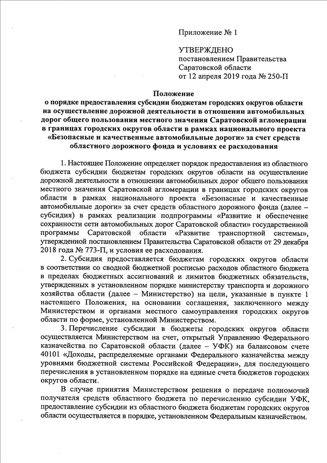 Постановление Правительства Саратовской области от 12.04.2019 N 250-П "О порядке предоставления субсидии бюджетам городских округов области на осуществление дорожной деятельности в отношении автомобильных дорог общего пользования местного значения Саратовской агломерации в границах городских округов области в рамках национального проекта "Безопасные и качественные автомобильные дороги" за счет средств областного дорожного фонда и условиях ее расходования" (вместе с "Положением о порядке предоставления субсидии бюджетам городских округов области на осуществление дорожной деятельности в отношении автомобильных дорог общего пользования местного значения Саратовской агломерации в границах городских округов области в рамках национального проекта "Безопасные и качественные автомобильные дороги" за счет средств областного дорожного фонда и условиях ее расходования")