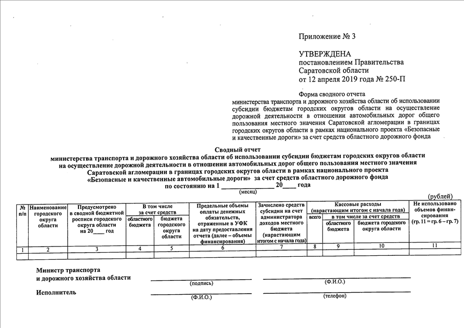 Постановление Правительства Саратовской области от 12.04.2019 N 250-П "О порядке предоставления субсидии бюджетам городских округов области на осуществление дорожной деятельности в отношении автомобильных дорог общего пользования местного значения Саратовской агломерации в границах городских округов области в рамках национального проекта "Безопасные и качественные автомобильные дороги" за счет средств областного дорожного фонда и условиях ее расходования" (вместе с "Положением о порядке предоставления субсидии бюджетам городских округов области на осуществление дорожной деятельности в отношении автомобильных дорог общего пользования местного значения Саратовской агломерации в границах городских округов области в рамках национального проекта "Безопасные и качественные автомобильные дороги" за счет средств областного дорожного фонда и условиях ее расходования")
