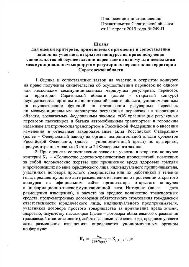 Постановление Правительства Саратовской области от 11.04.2019 N 249-П "Об установлении шкалы для оценки критериев, применяемых при оценке и сопоставлении заявок на участие в открытом конкурсе на право получения свидетельства об осуществлении перевозок по одному или нескольким межмуниципальным маршрутам регулярных перевозок на территории Саратовской области"