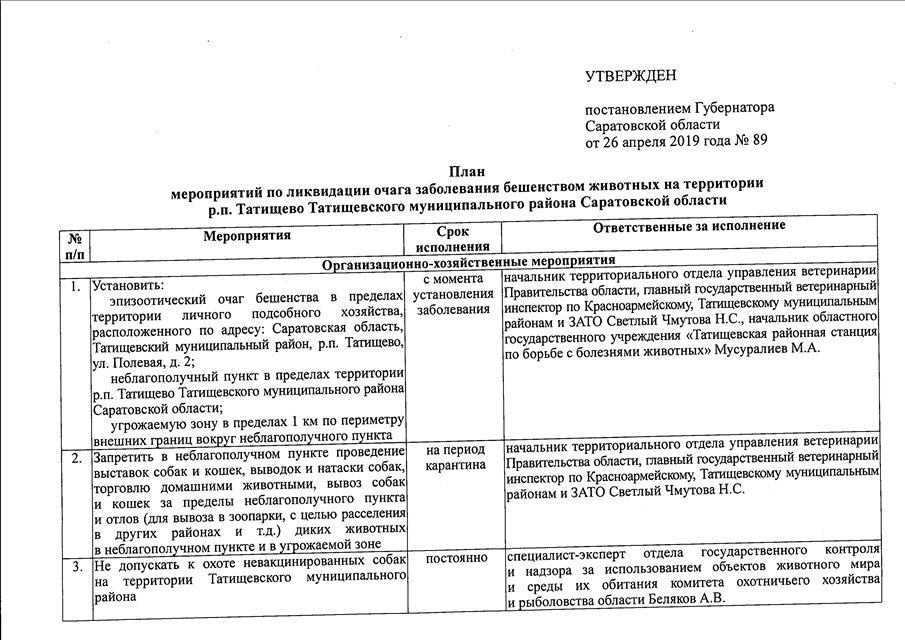 Постановление Губернатора Саратовской области от 26.04.2019 N 89 "Об установлении карантина по заболеванию бешенством животных на территории р.п. Татищево Татищевского муниципального района Саратовской области" (вместе с "Планом мероприятий по ликвидации очага заболевания бешенством животных на территории р.п. Татищево Татищевского муниципального района Саратовской области")