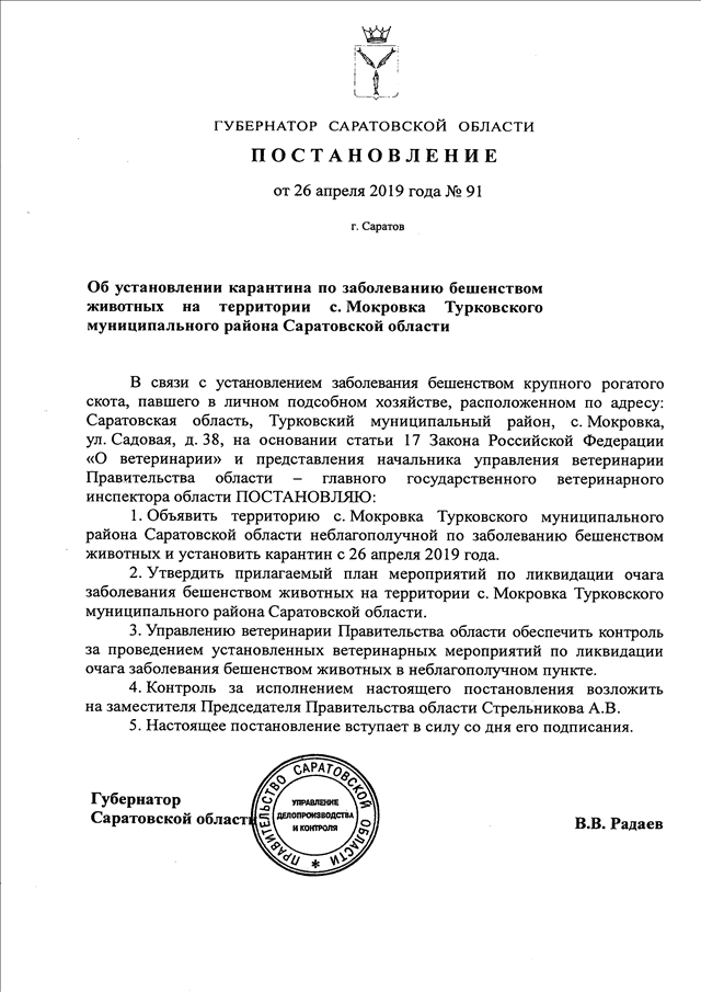 Постановление Губернатора Саратовской области от 26.04.2019 N 91 "Об установлении карантина по заболеванию бешенством животных на территории с. Мокровка Турковского муниципального района Саратовской области" (вместе с "Планом мероприятий по ликвидации очага заболевания бешенством животных на территории с. Мокровка Турковского муниципального района Саратовской области")