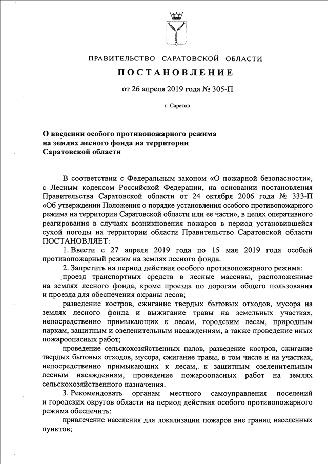 Постановление Правительства Саратовской области от 26.04.2019 N 305-П "О введении особого противопожарного режима на землях лесного фонда на территории Саратовской области"