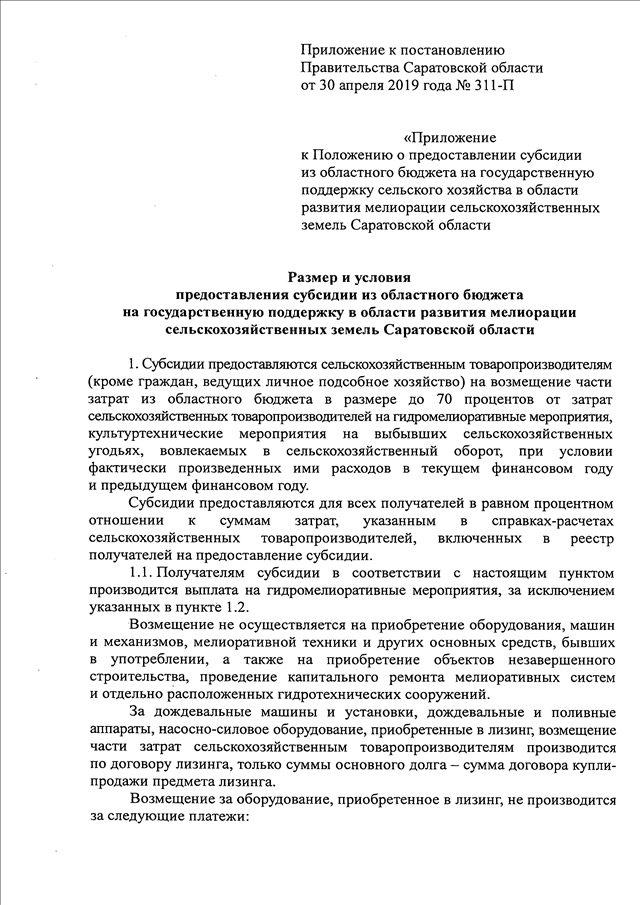 Постановление Правительства Саратовской области от 30.04.2019 N 311-П "О внесении изменений в постановление Правительства Саратовской области от 11 мая 2016 года N 211-П" (вместе с "Размером и условиями предоставления субсидии из областного бюджета на государственную поддержку в области развития мелиорации сельскохозяйственных земель Саратовской области")