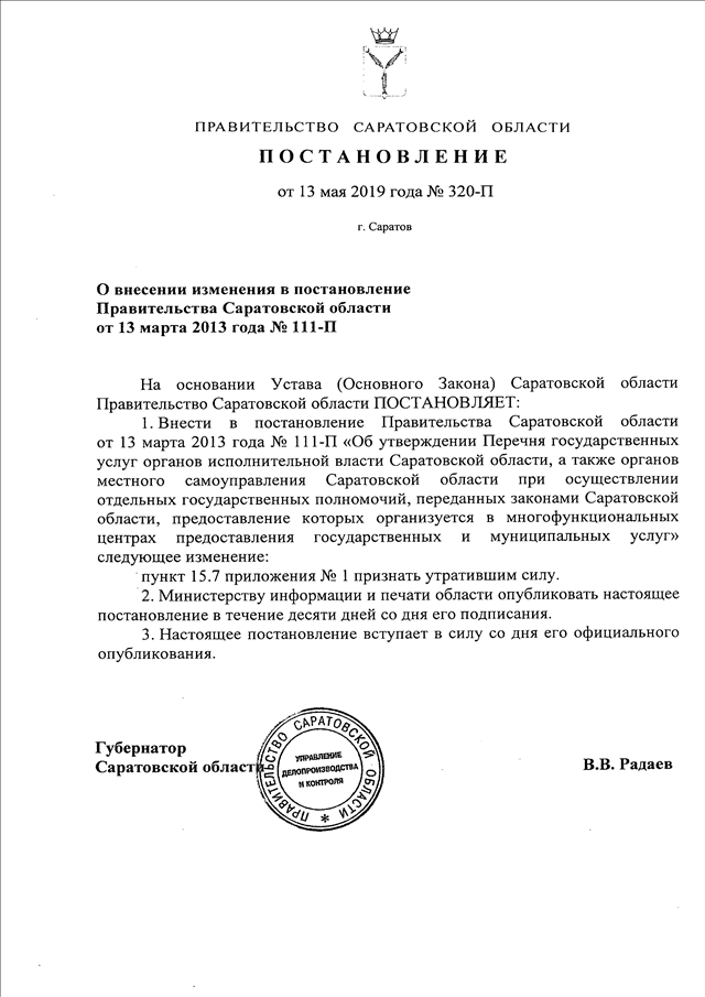 Постановление Правительства Саратовской области от 13.05.2019 N 320-П "О внесении изменения в постановление Правительства Саратовской области от 13 марта 2013 года N 111-П"