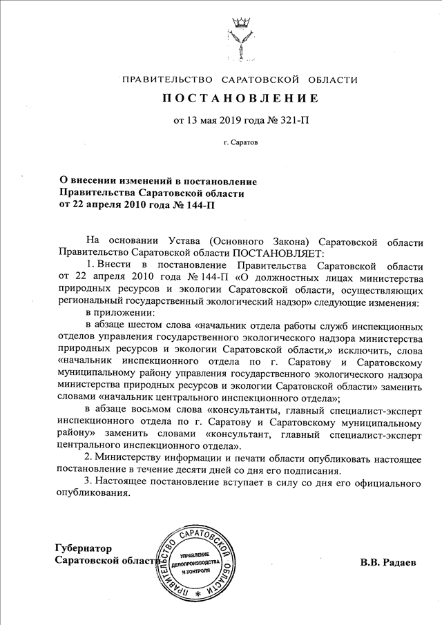 Постановление Правительства Саратовской области от 13.05.2019 N 321-П "О внесении изменений в постановление Правительства Саратовской области от 22 апреля 2010 года N 144-П"