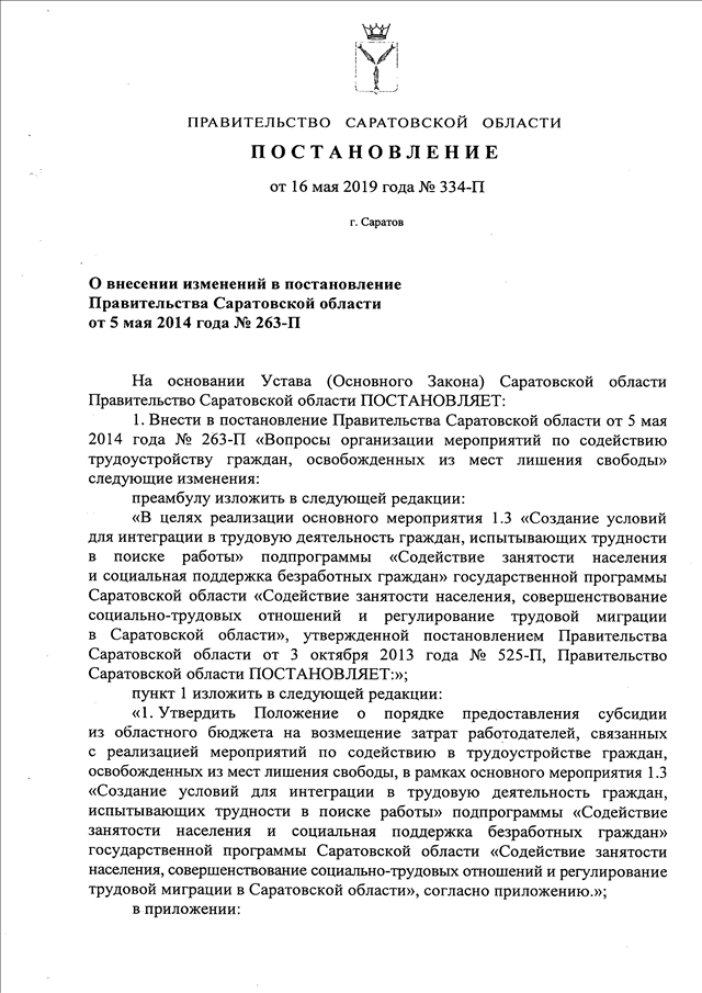 Постановление Правительства Саратовской области от 16.05.2019 N 334-П "О внесении изменений в постановление Правительства Саратовской области от 5 мая 2014 года N 263-П"