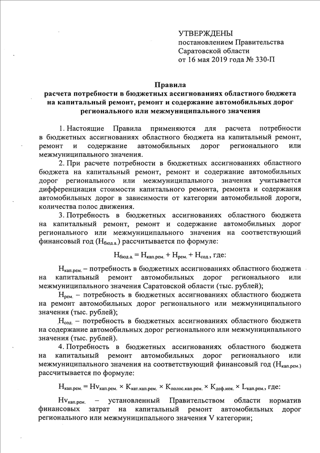 Постановление Правительства Саратовской области от 16.05.2019 N 330-П "О нормативах финансовых затрат и правилах расчета потребности в бюджетных ассигнованиях областного бюджета на капитальный ремонт, ремонт и содержание автомобильных дорог регионального или межмуниципального значения"
