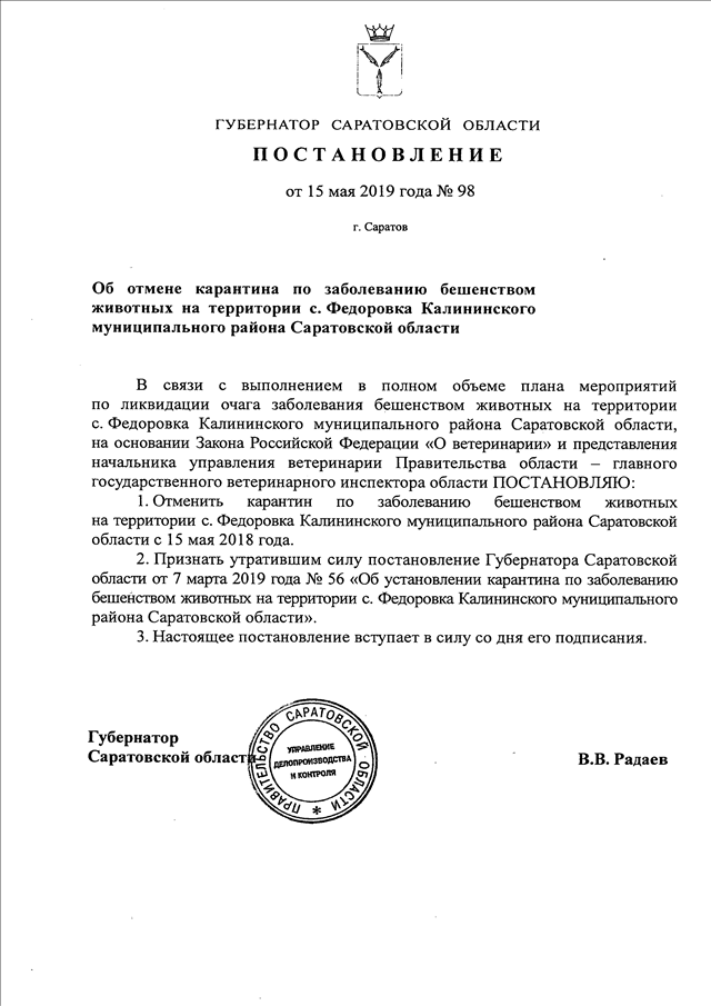 Постановление Губернатора Саратовской области от 15.05.2019 N 98 "Об отмене карантина по заболеванию бешенством животных на территории с. Федоровка Калининского муниципального района Саратовской области"