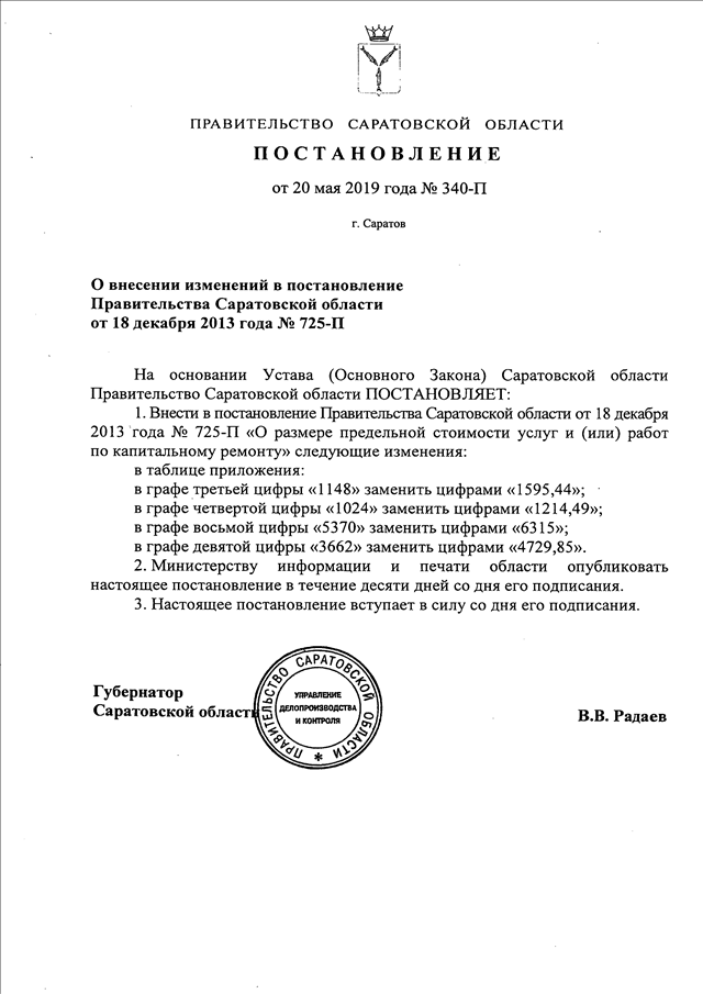 Постановление Правительства Саратовской области от 20.05.2019 N 340-П "О внесении изменений в постановление Правительства Саратовской области от 18 декабря 2013 года N 725-П"