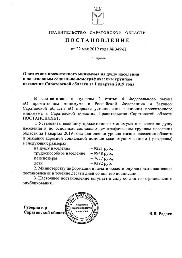 Постановление Правительства Саратовской области от 22.05.2019 N 349-П "О величине прожиточного минимума на душу населения и по основным социально-демографическим группам населения Саратовской области за I квартал 2019 года"