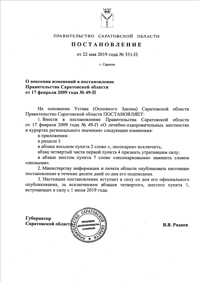 Постановление Правительства Саратовской области от 22.05.2019 N 351-П "О внесении изменений в постановление Правительства Саратовской области от 17 февраля 2009 года N 49-П"