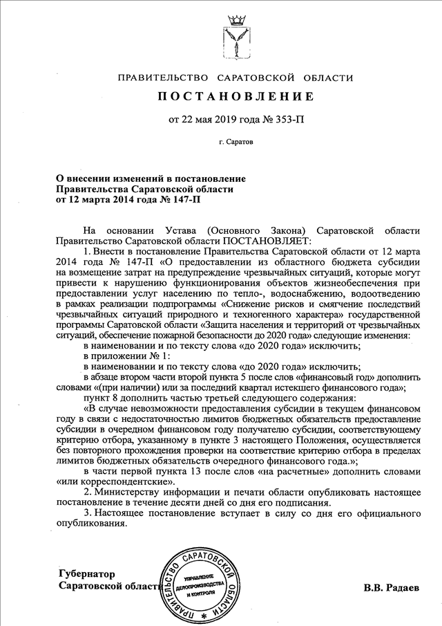 Постановление Правительства Саратовской области от 22.05.2019 N 353-П "О внесении изменений в постановление Правительства Саратовской области от 12 марта 2014 года N 147-П"