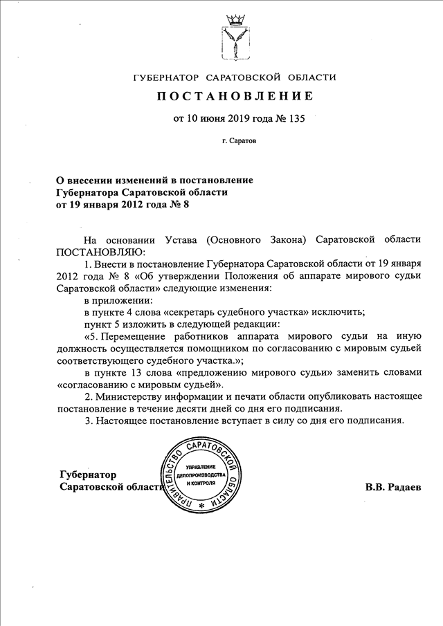 Постановление Губернатора Саратовской области от 10.06.2019 N 135 "О внесении изменений в постановление Губернатора Саратовской области от 19 января 2012 года N 8"