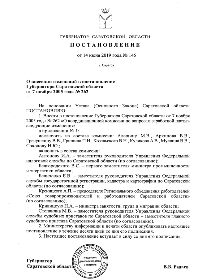Постановление Губернатора Саратовской области от 14.06.2019 N 145 "О внесении изменений в постановление Губернатора Саратовской области от 7 ноября 2005 года N 262"