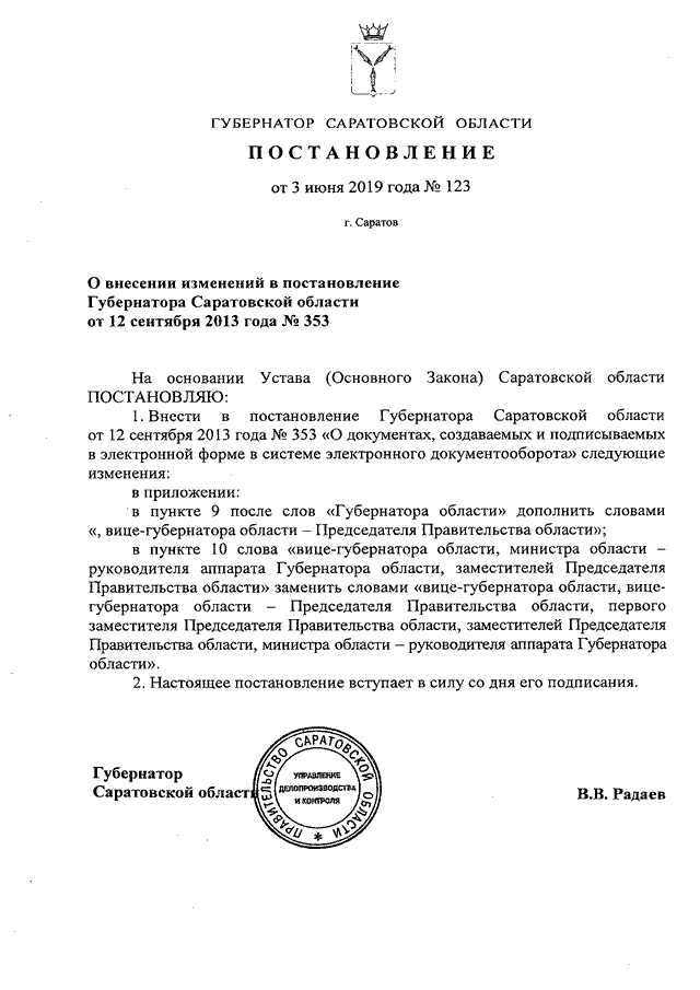 Постановление Губернатора Саратовской области от 03.06.2019 N 123 "О внесении изменений в постановление Губернатора Саратовской области от 12 сентября 2013 года N 353"