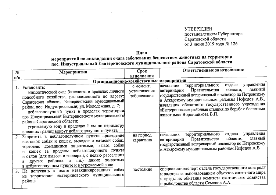 Постановление Губернатора Саратовской области от 03.06.2019 N 126 "Об установлении карантина по заболеванию бешенством животных на территории пос. Индустриальный Екатериновского муниципального района Саратовской области" (вместе с "Планом мероприятий по ликвидации очага заболевания бешенством животных на территории пос. Индустриальный Екатериновского муниципального района Саратовской области")