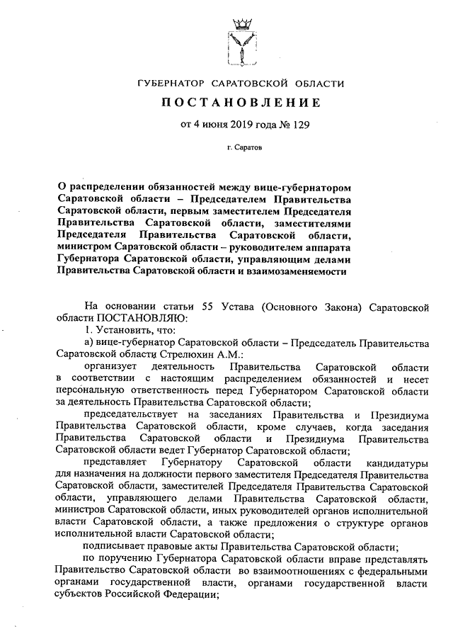Постановление Губернатора Саратовской области от 04.06.2019 N 129 "О распределении обязанностей между вице-губернатором Саратовской области - председателем Правительства Саратовской области, первым заместителем Председателя Правительства Саратовской области, заместителями Председателя Правительства Саратовской области, министром Саратовской области - руководителем аппарата Губернатора Саратовской области, управляющим делами Правительства Саратовской области и взаимозаменяемости"