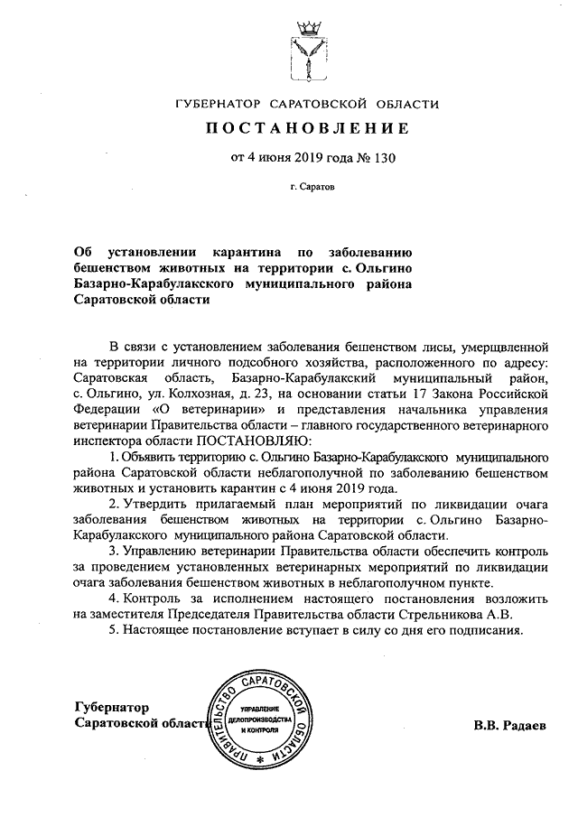 Постановление Губернатора Саратовской области от 04.06.2019 N 130 "Об установлении карантина по заболеванию бешенством животных на территории с. Ольгино Базарно-Карабулакского муниципального района Саратовской области" (вместе с "Планом мероприятий по ликвидации очага заболевания бешенством животных на территории с. Ольгино Базарно-Карабулакского муниципального района Саратовской области")