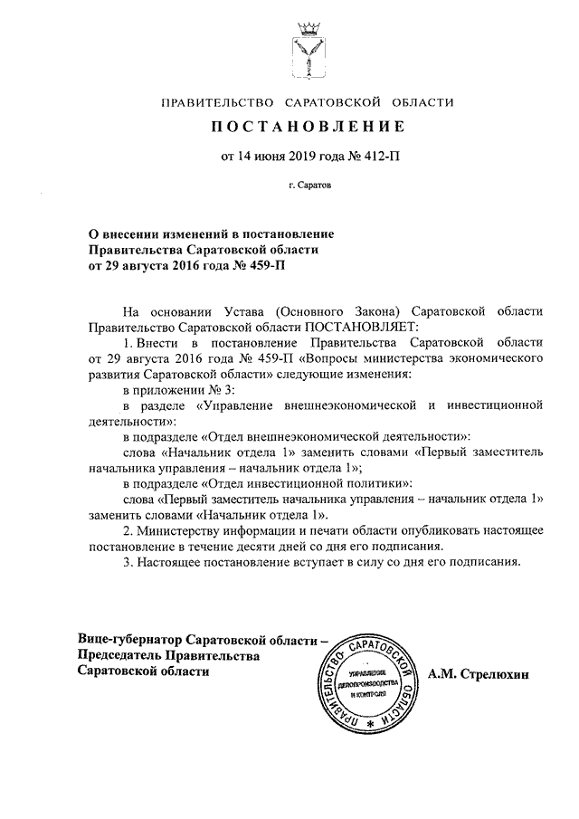 Постановление Правительства Саратовской области от 14.06.2019 N 412-П "О внесении изменений в постановление Правительства Саратовской области от 29 августа 2016 года N 459-П"