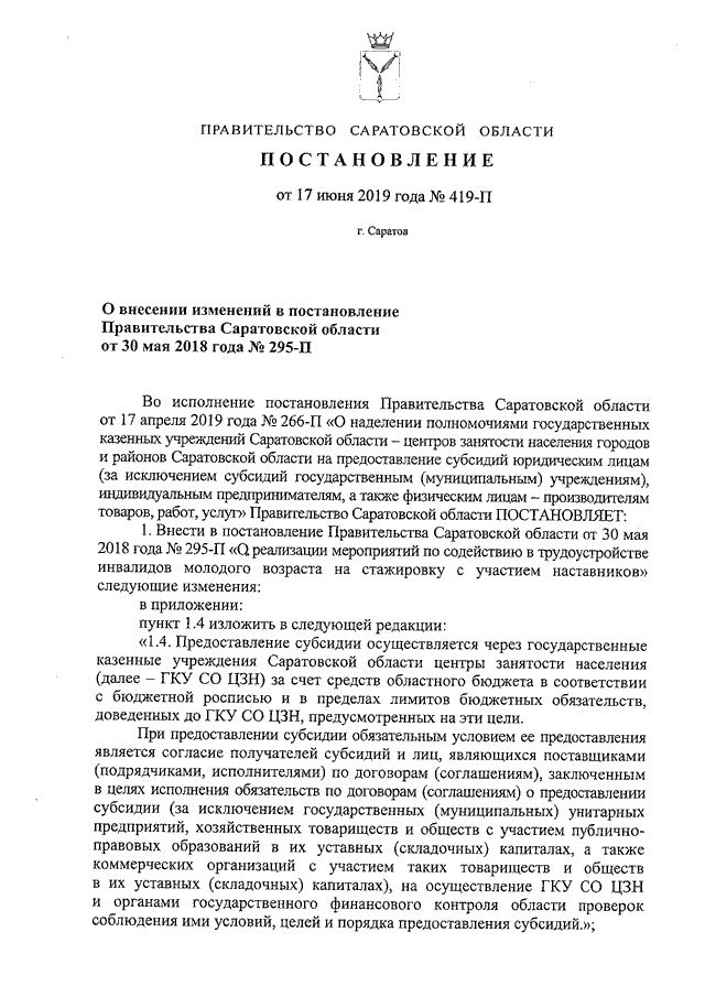 Постановление Правительства Саратовской области от 17.06.2019 N 419-П "О внесении изменений в постановление Правительства Саратовской области от 30 мая 2018 года N 295-П"