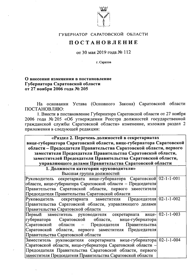 Постановление Губернатора Саратовской области от 30.05.2019 N 112 "О внесении изменения в постановление Губернатора Саратовской области от 27 ноября 2006 года N 205"