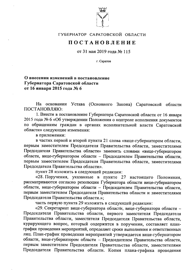 Постановление Губернатора Саратовской области от 31.05.2019 N 115 "О внесении изменений в постановление Губернатора Саратовской области от 16 января 2015 года N 6"