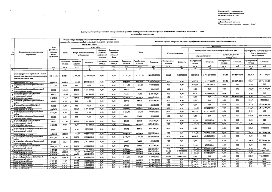 Постановление Правительства Саратовской области от 29.05.2019 N 377-П "О внесении изменений в постановление Правительства Саратовской области от 1 апреля 2019 года N 212-П" (вместе с "Перечнем многоквартирных домов, признанных аварийными до 1 января 2017 года", "Планом реализации мероприятий по переселению граждан из аварийного жилищного фонда, признанного таковым до 1 января 2017 года, по способам переселения", "Планом мероприятий по переселению граждан из аварийного жилищного фонда, признанного таковым до 1 января 2017 года")