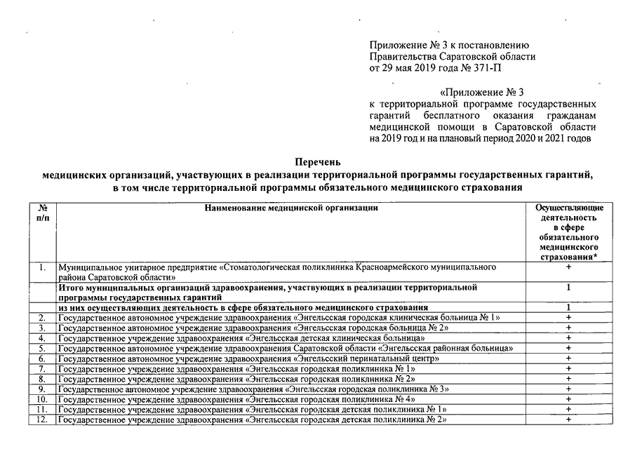 Постановление Правительства Саратовской области от 29.05.2019 N 371-П "О внесении изменений в постановление Правительства Саратовской области от 25 декабря 2018 года N 720-П" (вместе с "Перечнем медицинских организаций, участвующих в реализации территориальной программы государственных гарантий, в том числе территориальной программы обязательного медицинского страхования")