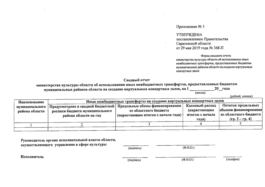 Постановление Правительства Саратовской области от 29.05.2019 N 368-П "О порядке предоставления из областного бюджета бюджетам муниципальных районов области иных межбюджетных трансфертов на создание виртуальных концертных залов" (вместе с "Положением о порядке предоставления из областного бюджета бюджетам муниципальных районов области иных межбюджетных трансфертов на создание виртуальных концертных залов")