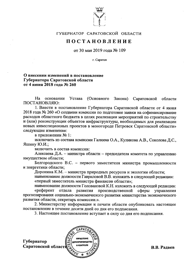 Постановление Губернатора Саратовской области от 30.05.2019 N 109 "О внесении изменений в постановление Губернатора Саратовской области от 4 июня 2018 года N 260"