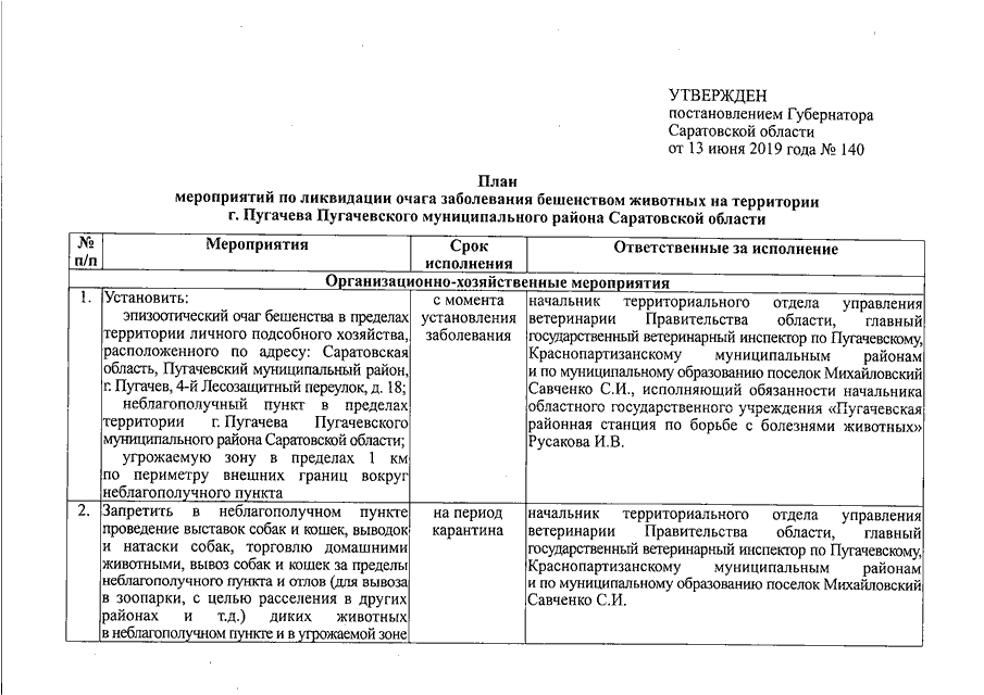 Постановление Губернатора Саратовской области от 13.06.2019 N 140 "Об установлении карантина по заболеванию бешенством животных на территории г. Пугачева Пугачевского муниципального района Саратовской области" (вместе с "Планом мероприятий по ликвидации очага заболевания бешенством животных на территории г. Пугачева Пугачевского муниципального района Саратовской области")