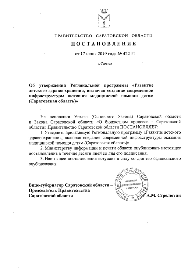 Постановление Правительства Саратовской области от 17.06.2019 N 422-П "Об утверждении региональной программы "Развитие детского здравоохранения, включая создание современной инфраструктуры оказания медицинской помощи детям (Саратовская область)"