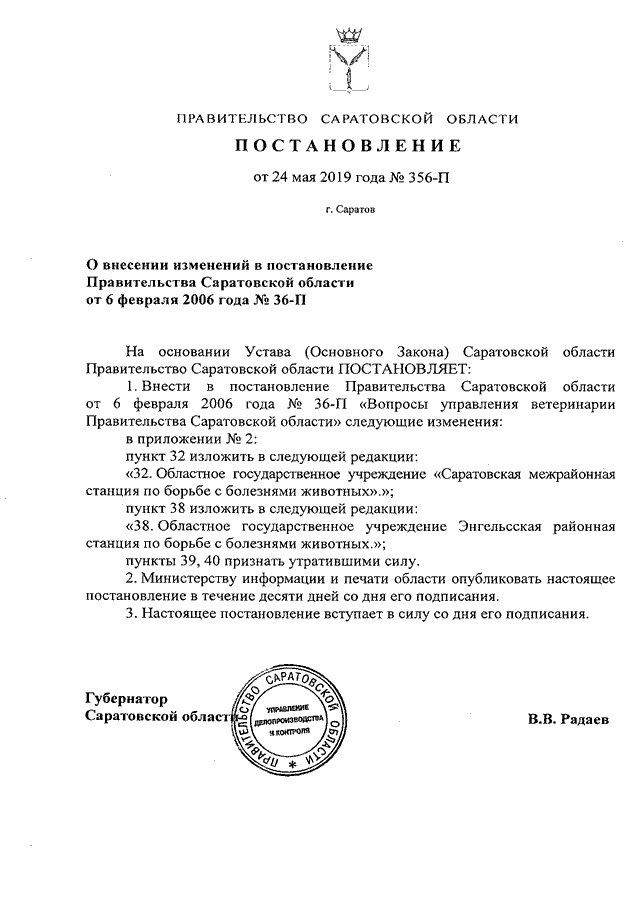 Постановление Правительства Саратовской области от 24.05.2019 N 356-П "О внесении изменений в постановление Правительства Саратовской области от 6 февраля 2006 года N 36-П"