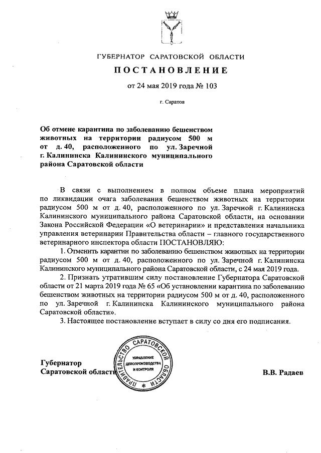 Постановление Губернатора Саратовской области от 24.05.2019 N 103 "Об отмене карантина по заболеванию бешенством животных на территории радиусом 500 м от д. 40, расположенного по ул. Заречной г. Калининска Калининского муниципального района Саратовской области"