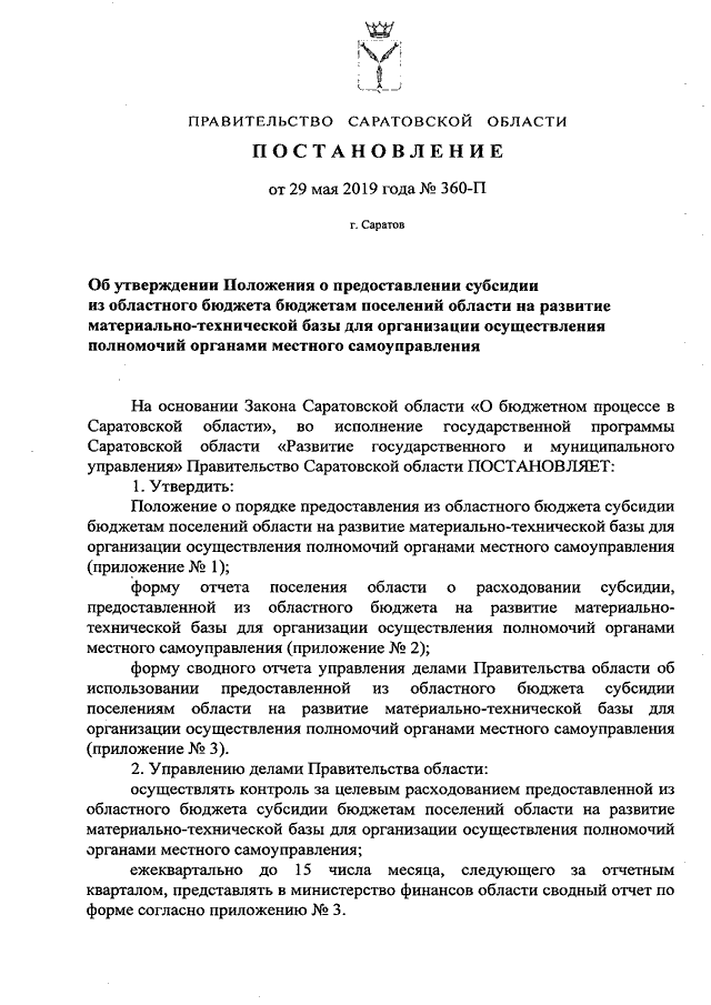 Постановление Правительства Саратовской области от 29.05.2019 N 360-П "Об утверждении Положения о предоставлении субсидии из областного бюджета бюджетам поселений области на развитие материально-технической базы для организации осуществления полномочий органами местного самоуправления"