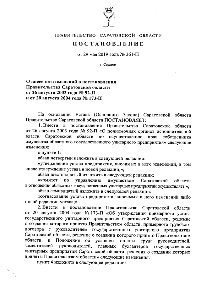 Постановление Правительства Саратовской области от 29.05.2019 N 361-П "О внесении изменений в постановления Правительства Саратовской области от 26 августа 2003 года N 92-П и от 20 августа 2004 года N 173-П"