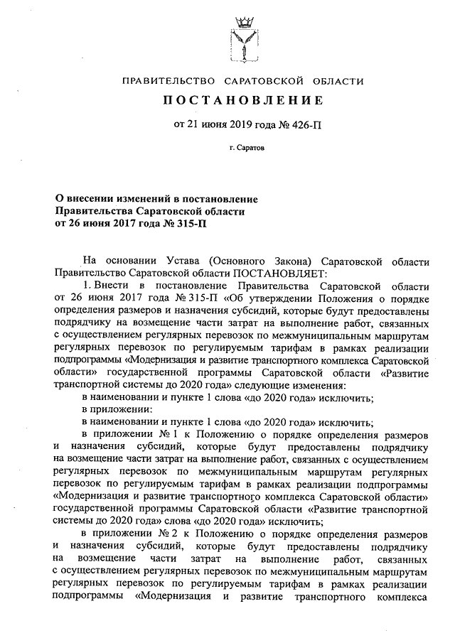 Постановление Правительства Саратовской области от 21.06.2019 N 426-П "О внесении изменений в постановление Правительства Саратовской области от 26 июня 2017 года N 315-П"