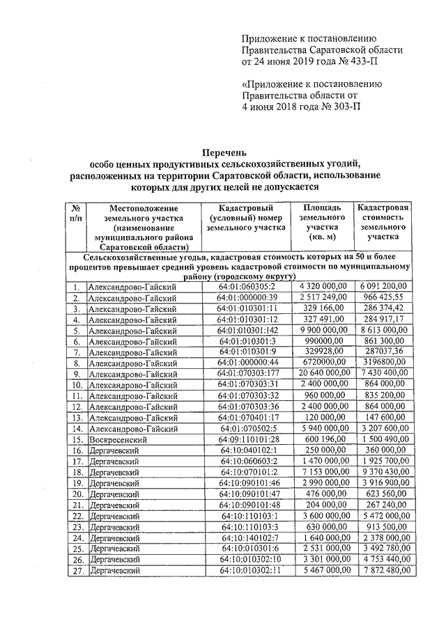 Постановление Правительства Саратовской области от 24.06.2019 N 433-П "О внесении изменения в постановление Правительства Саратовской области от 4 июня 2018 года N 303-П" (вместе с "Перечнем особо ценных продуктивных сельскохозяйственных угодий, расположенных на территории Саратовской области, использование которых для других целей не допускается")
