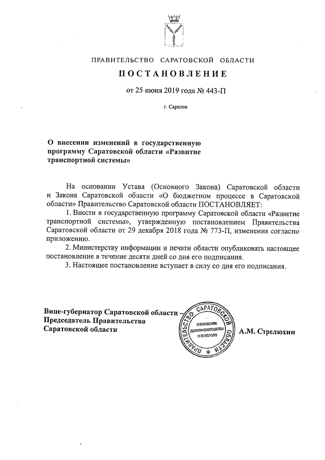 Постановление Правительства Саратовской области от 25.06.2019 N 443-П "О внесении изменений в государственную программу Саратовской области "Развитие транспортной системы"